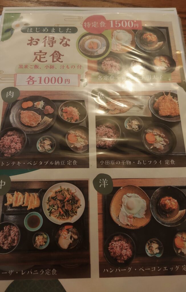 提供される料理は、黒米ご飯やみそ汁、ぬか漬け、ぬか漬け、削りカツオ節など、
