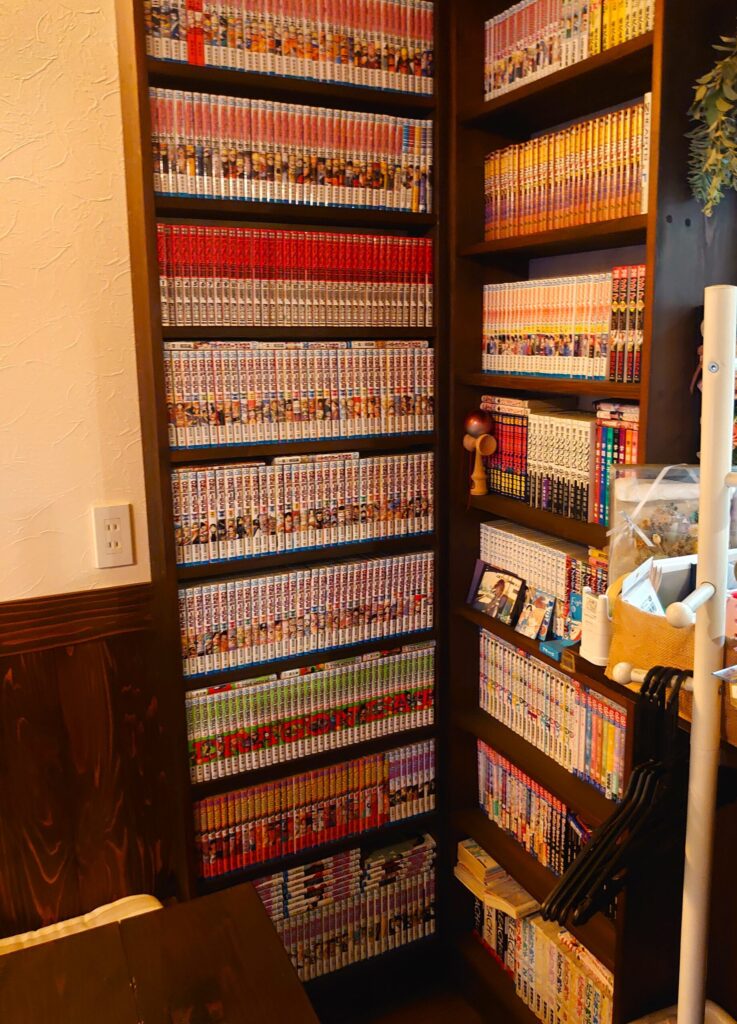 棚にはどこか懐かしい漫画たち、そしてカウンターの片隅には、