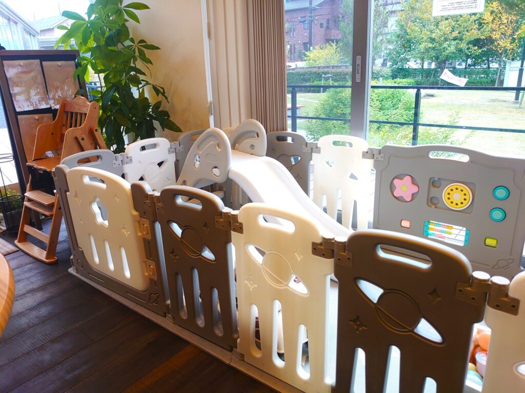 ミニ滑り台、囲い、読みかけの絵本。低い目線で世界をつくり、親の視線