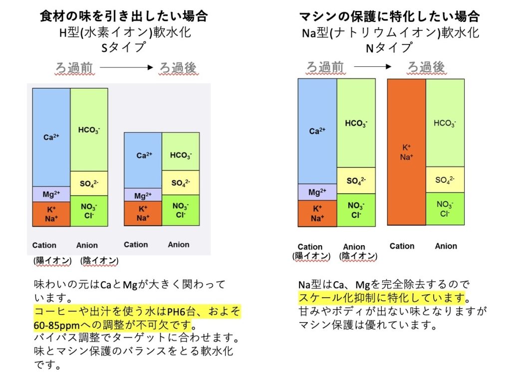 コーヒーや料理でも水に含まれるCaやMgによって甘みや味わいに変化を及ぼす為、使用することに水がより味の角が取れて重心が下がったような舌触りになります。