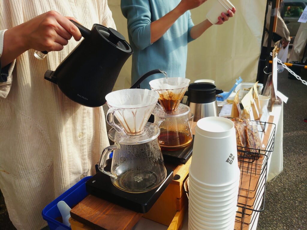 薄雲を割る朝の光。テントの下で湯が細く落ち、白い紙コップに香りが満ちる。