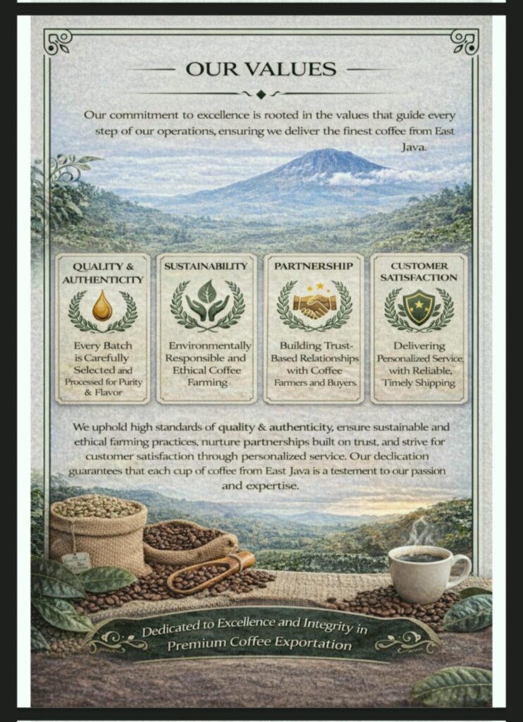この会社の軸にあるのは、東ジャワ産の農産物をグローバル市場へ届ける輸出会社という立場だ。コーヒーだけではなく、カカオ、ココナッツ由来製品、ココピート、乾燥タロイモ葉、ハーブティーなども扱っている。その広がりは単なる“品目の多さ”ではなく、地域の農業そのものを輸出の形に載せていく企業としての姿を示している。
