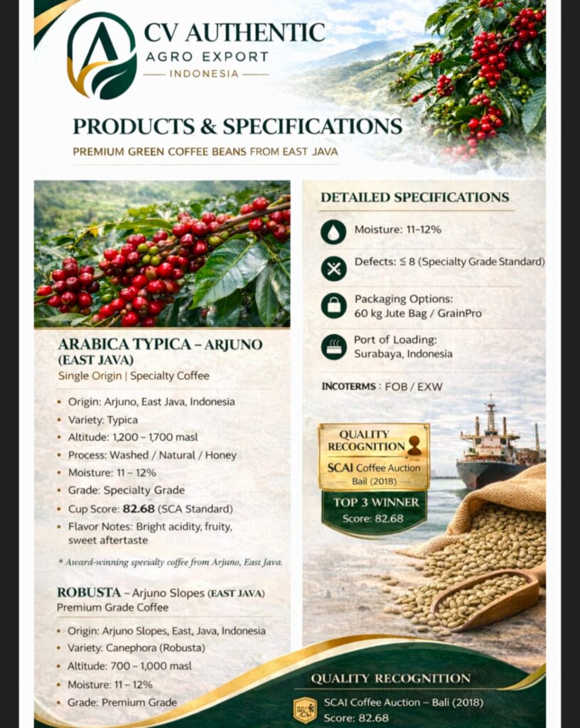 ただ、その中でもコーヒーはやはり中核に見える。資料ではArabica Arjuno – Specialty Grade、Robusta – Specialty Grade / Premium Grade、さらにRoasted & Ground Coffeeまでラインナップされており、単に原料を出すだけではなく、用途や顧客層に応じて整理された商品設計がなされている。
