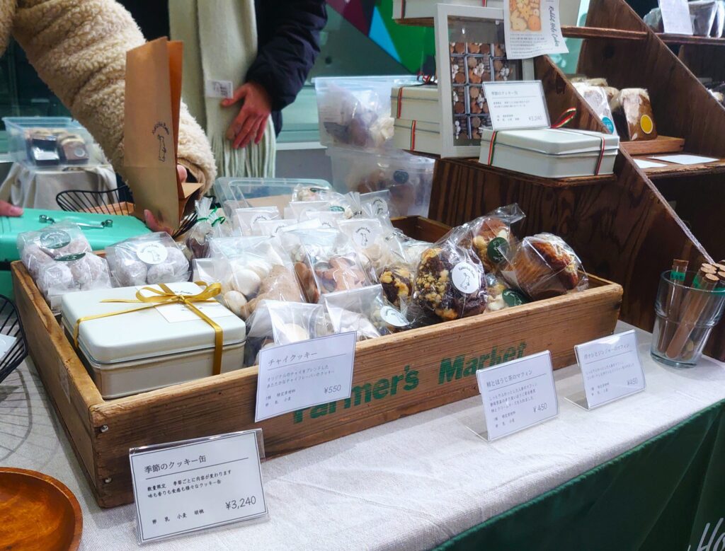木箱にぎゅっと詰まったクッキー缶や焼き菓子たち。
