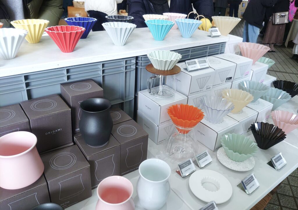 色とりどりのドリッパーとカップが並ぶ ORIGAMI のブースだった。
