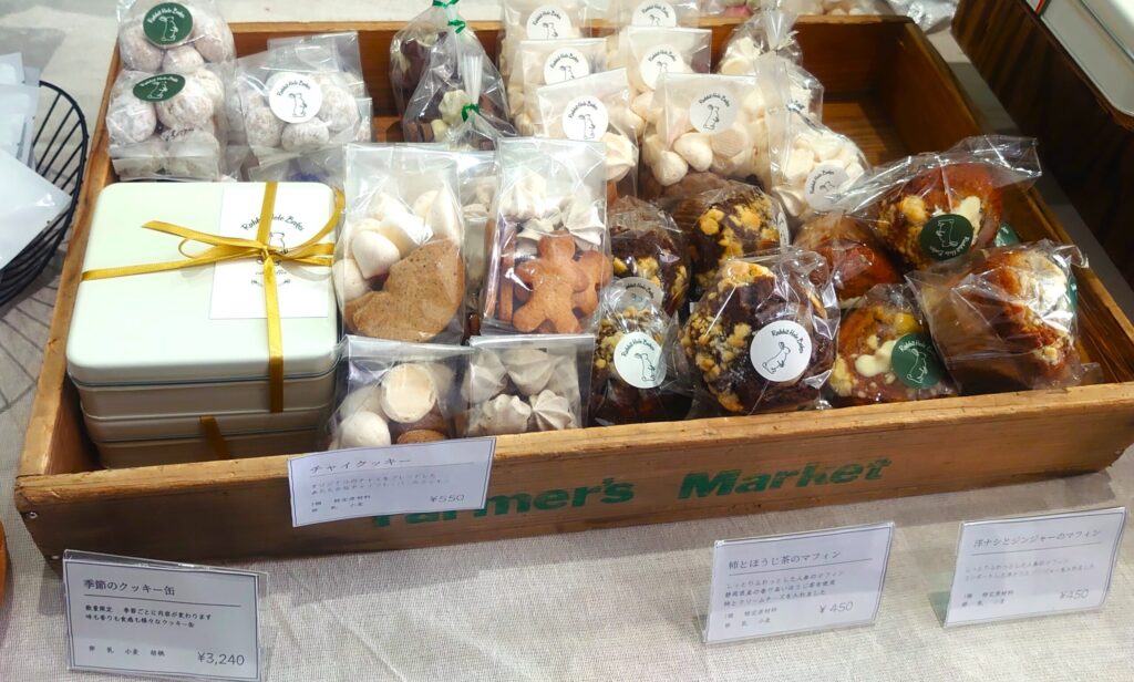BITTY の木箱の棚には、黄色いロゴシールが貼られた焼き菓子。