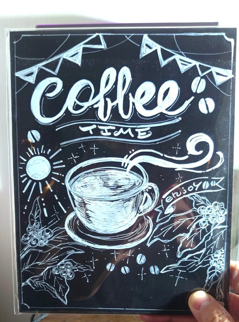 黒板のようなボードに、白い線でカップと湯気が描かれている。
