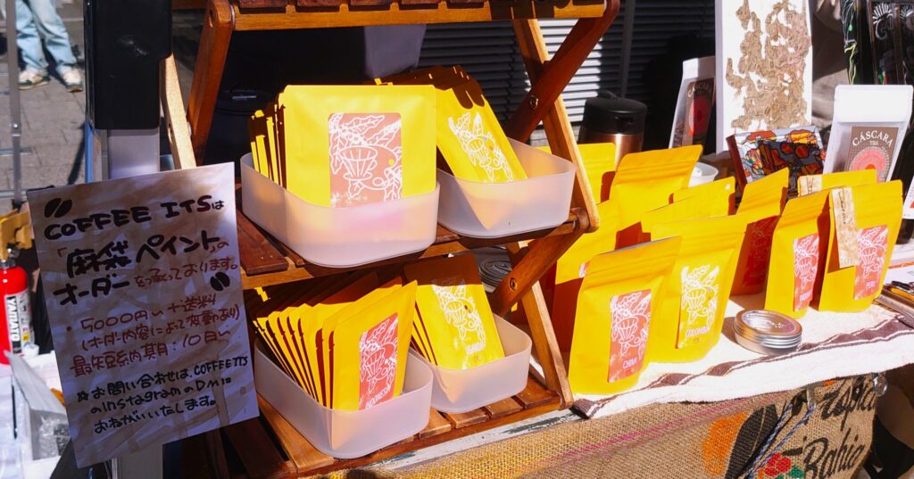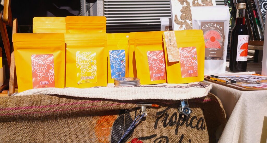 その中で、COFFEE ITSのブースは色が先に届く。黄色い袋がずらりと並び、