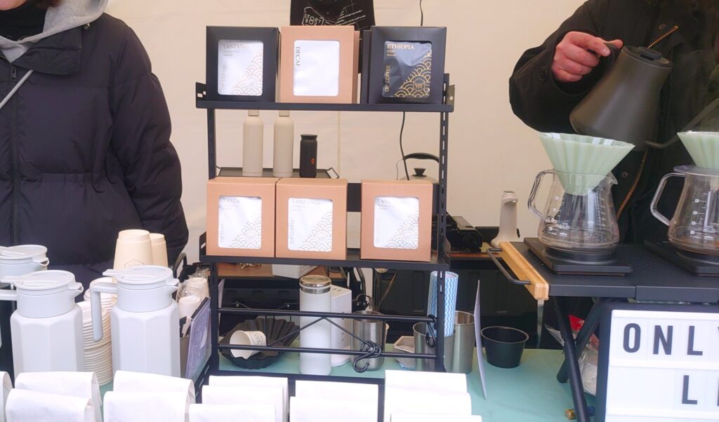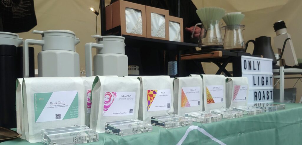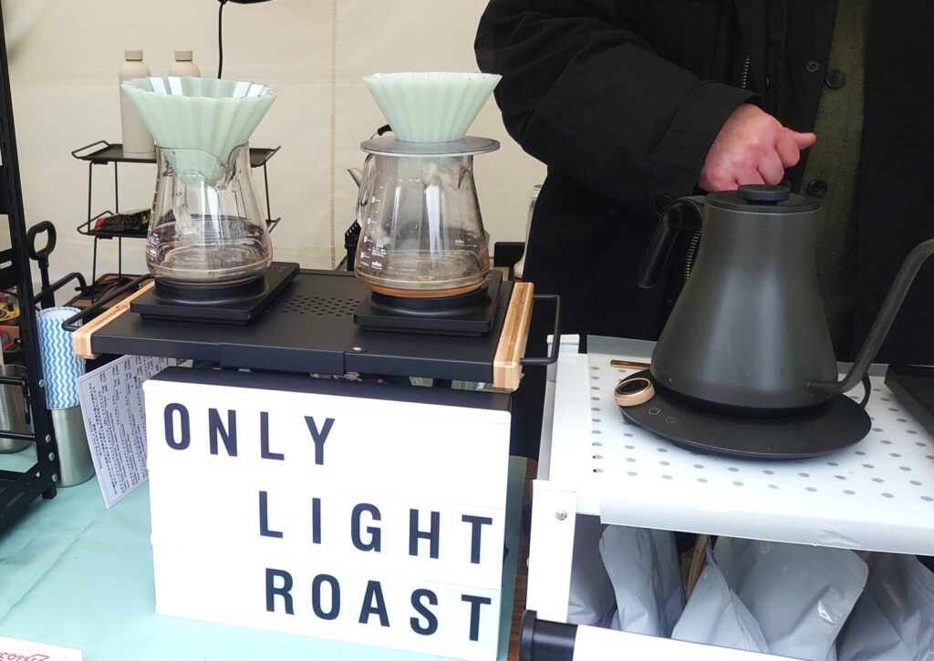 テントの端で、ミントグリーンのドリッパーが並び、ライトボックスには大きく「ONLY LIGHT ROAST」。