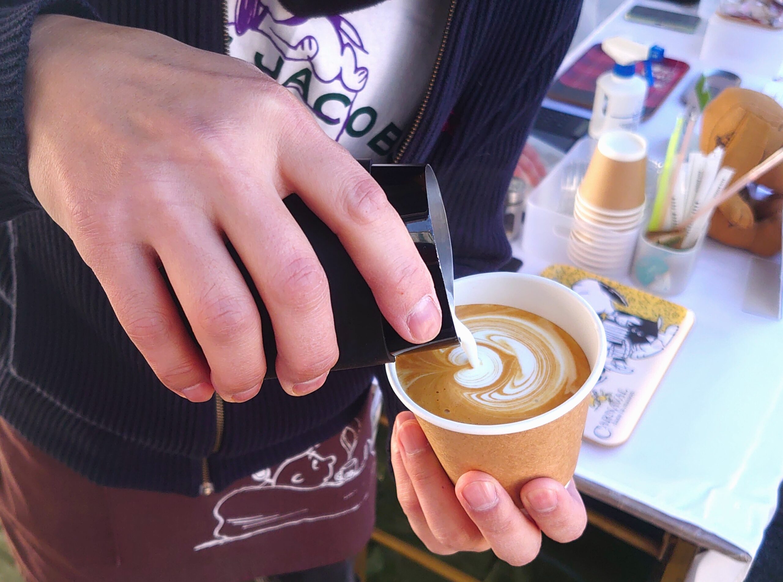 会場の白いテントの中で、湯気は小さな旗みたいに立って、カップの縁でゆっくりほどけていく。