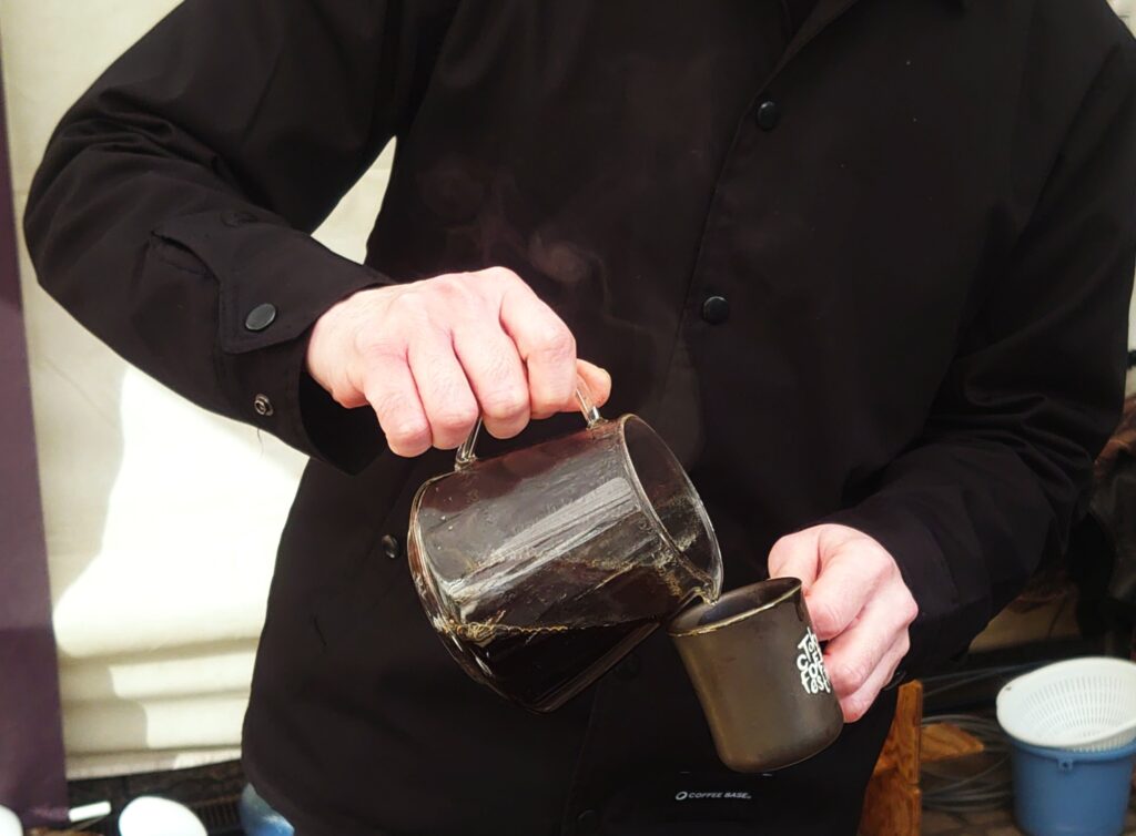 テントのあいだから差し込む冬の光が、銀色のケトルとサーバーのガラス