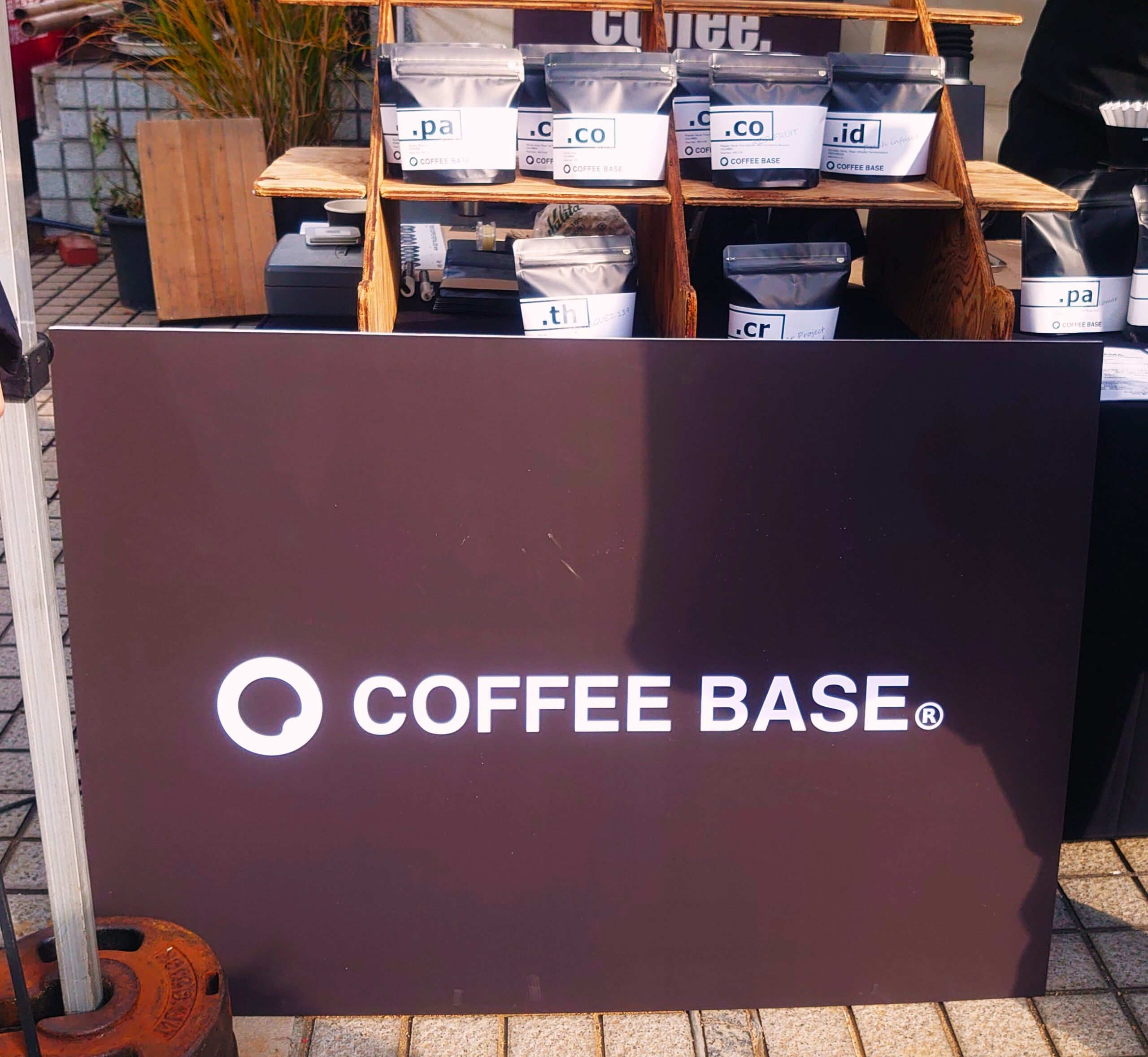 テーブルの向こうに見えるのは、「COFFEE BASE」のロゴと、