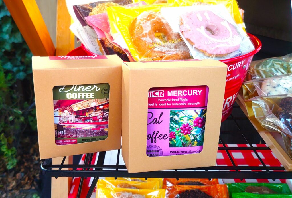 MERCURY CAL COFFEE SET。箱の表情がまず強い。工具箱の窓に、コーヒーのラベルが覗く。
