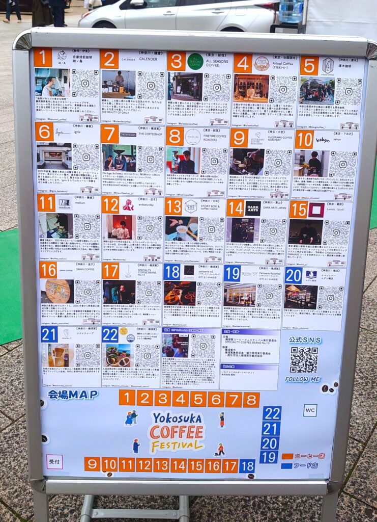 出店は、東京・湘南・横須賀近辺の実力店がまとまって並ぶ。たとえばコーヒーは Lonich, / ALL SEASONS COFFEE / Ariowl Coffee / kakyo / Finetime Coffee Roasters / 珈ノ鳥 / Fucuramu Coffee Roastery / 厚木珈琲 / STORY BOX & coffee roaster / SWAN COFFEE / andsaturday / Dark Arts Coffee / Calender / ignis / medium / THE COFFEESHOP / No.13。フードは RESTORE &ととのい / Raconter / ㎡(自家製チョコと焼菓子)/ ツクイクレープ / エデン横浜。