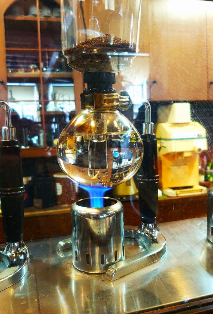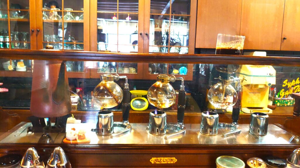 ガラス戸を開けると、奥のサイフォンが静かに湯気を上げていた。