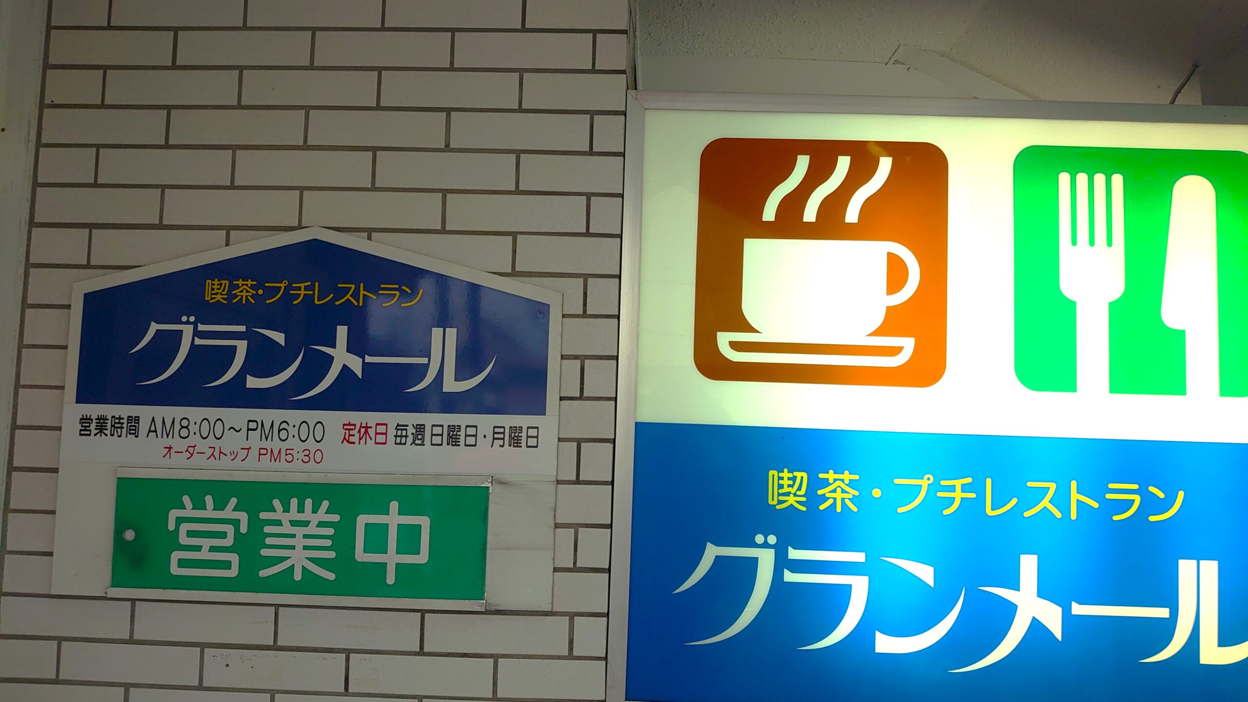 ・青い看板に「喫茶・プチレストラン グランメール」の文字が目印