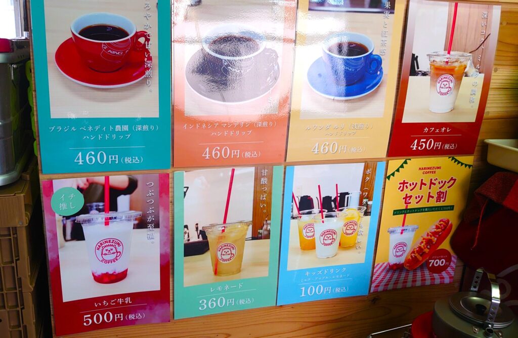 入り口には、子ども向けドリンクやレモネード、ホットドッグの案内。