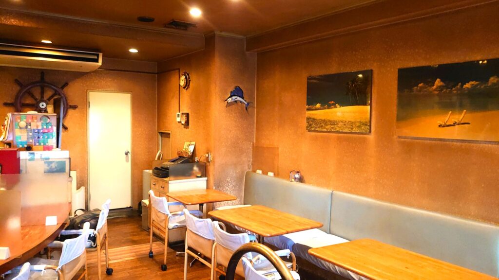 A,海を意識した内装にしていますとのこと。お父様が船乗りをしていたことやマスターさんが海が好きということで。海の写真やポスター、サーフボードの置物、船のハンドルなど海を意識させたもらえるようなものがたくさんありました!