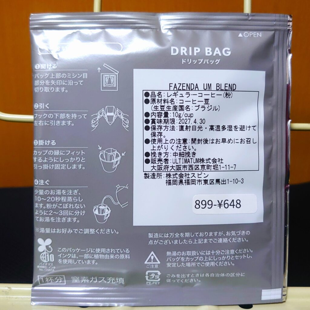 今回の購入は、DRIP BAG の BRAZIL/FAZENDA UM BLEND。