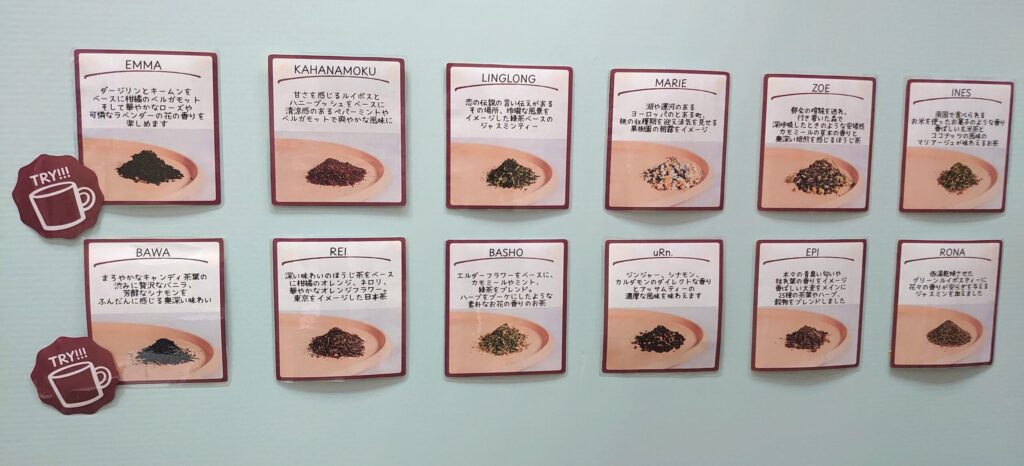 uRnさんのお茶すべてブレンドティーとなっています。理由としては、お客様の気分によってその時のものが提供できるようにするため。また海外ではお茶を香水のように自身で香りを選択できることを皆様に知っていただきたいこと。